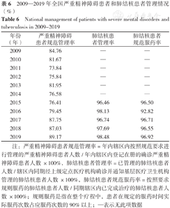 严重精神障碍患者规范管理率在2009—2019年波动上升,截至2019年严重精神障碍患者规范管理率达89.17%,较2009年上升4.41%,平均年增长率为0.66%。2015—2019年肺结核患者管理率及肺结核患者规范服药率均稳定在95%以上,截至2019年,肺结核患者健康管理率达98.48%,肺结核患者规范服药率达96.92%,详见表6。