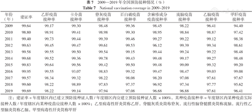 中国疾病预防控制中心利用2017年全球疾病负担研究结果,比较了1990—2017年主要疾病的寿命损失年(YLL)、健康寿命损失年(YLD)和伤残调整寿命年(DALY),其中包括计划免疫性疾病(白喉、百日咳、破伤风和麻疹)和肺结核等传染性疾病,由传染病、孕产妇、新生儿和营养状况引起的YLL、YLD和DALY大幅下降,而由非传染性疾病引起的YLL、YLD、DALY普遍上升[15]。在一项关于中国2004—2013年45种法定报告传染病的发病率和死亡率趋势的研究中发现,虽然传染病总发病率从2004年起呈上升趋势,但2009年之后趋于平稳,总的增长趋势在2009年后发生变化,2009—2013年的传染病发病率(2.3%)年变化率明显低于2004—2008年(6.2%)[16]。由此可见,在疫苗可控传染病方面,预防接种发挥了重要作用,2009年以后,预防接种工作全部依托于基本公共卫生服务项目,国家统筹的计划免疫、传染病防治重大专项等传染病防治措施由基层医疗卫生机构开展。传染病防控所取得的成绩是各方共同努力的结果,其中,国家基本公共卫生服务项目也做出了重大贡献,发挥了重要作用。