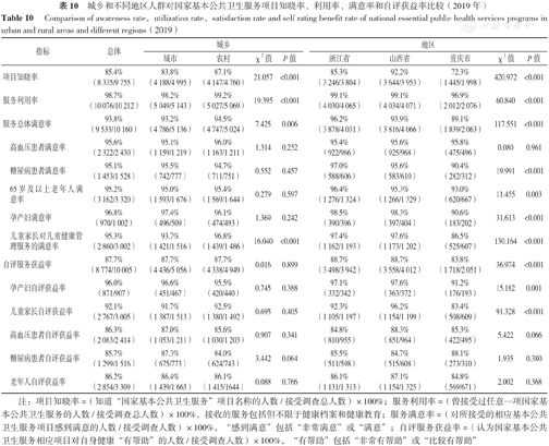 Comparison of awareness rate,utilization rate,satisfaction rate and self rating benefit rate of national essential public health services programs in urban and rural areas and different regions(2019)