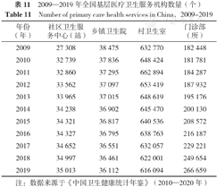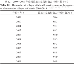 从基层医疗卫生机构数量上来看,社区卫生服务中心(站)和门诊部(所)数量呈现持续上升趋势,乡镇卫生院呈现持续下降趋势,村卫生室先下降后上升。据《中国卫生健康统计年鉴》(2010—2020年),截至2019年,全国基层医疗卫生机构数95.44万个,占医疗卫生机构总数的94.72%,其中社区卫生服务中心(站)35 013个,乡镇卫生院36 112个,村卫生室616 094个,门诊部(所)266 659个,详见表11。2009—2019年,设卫生室的村数占行政村的比例逐年上升,从2009年的90.4%上升到2019年的94.8%,详见表12。