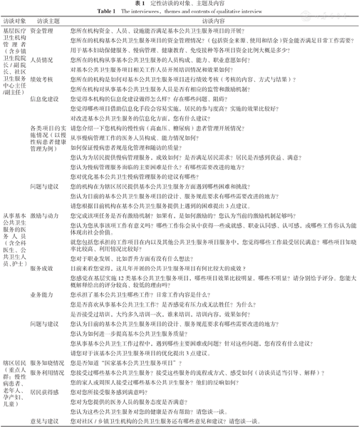 2018—2019年,本课题组分别在北京、湖南、四川、浙江、山西、重庆地区开展定性访谈,共计访谈145名医疗卫生工作者,包括基层医疗卫生服务机构管理人员(编号M01~77)、从事基本公共卫生服务的医务人员(编号D01~32)、辖区居民(P01~36)。2018年,在北京丰台区、东城区、延庆区,湖南省长沙市、四川省泸州市、重庆市开展访谈,共访谈92名医疗卫生工作者;2019年,在浙江省杭州市、湖州市,山西省太原市、晋中市,重庆市开展现场访谈,共访谈53名医疗卫生工作者。两次访谈提纲及内容汇总见表1。经过培训的访谈员对材料进行记录和录音,经文字转录后,采用质性分析软件Nvivo11 Plus进行编码分析,提炼主题概念并归类、汇总主要观点[4]。