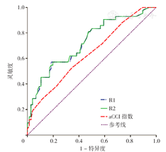 图1、表3显示了R1,R2,aCCI指数对结直肠癌根治术术后并发症的预测价值。R1预测结直肠癌根治术术后并发症的ROC曲线下面积(AUC)为0.727〔95%CI(0.631,0.823),P<0.001〕,最佳截断值为0.114,灵敏度为57.1%,特异度为81.6%;R2预测结直肠癌根治术术后并发症的AUC为0.728〔95%CI(0.632,0.824),P<0.001〕,最佳截断值为0.516,灵敏度为57.1%,特异度为80.3%;aCCI指数预测结直肠癌根治术术后并发症的AUC为0.638〔95%CI(0.534,0.742),P=0.013〕,最佳截断值为3.500,灵敏度为52.4%,特异度为65.8%。
