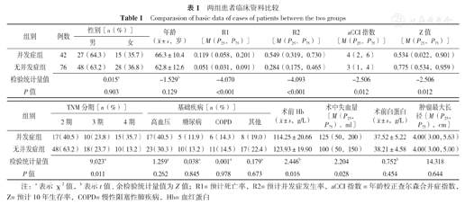 并发症组R1、R2,aCCI指数、术中失血量高于无并发症组,Z、术前Hb水平低于无并发症组,差异有统计学意义(P<0.05)。两组TNM分期比较,差异有统计学意义(P<0.05)。两组性别、年龄、基础疾病(高血压、糖尿病、COPD及其他)发病率、术前白蛋白水平、肿瘤最大长径比较,差异无统计学意义(P>0.05),见表1。