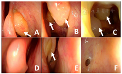 注:A~C箭头所示为左侧鼻道可见多个新生物,E箭头所示为右侧可见新生物,D、F显示未见新生物