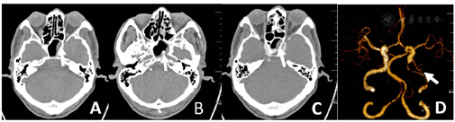 注:A~C颅脑CT箭头所示为左侧蝶窦黏膜增厚,D颅脑CTA箭头所示为LICA狭窄、LMCA远端分支稀疏;CTA=CT血管造影,LICA=左侧颈内动脉,LMCA=左侧大脑中动脉