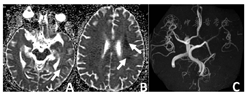注:A、B颅脑ADC箭头所示为低信号影,C颅脑MRA为LICA颅内段未见显影;ADC=表观弥散系数,MRA=磁共振血管造影