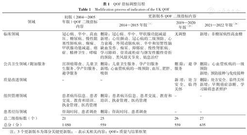 在实施过程中,NHS发现初版QOF包含的患者病历信息、患者调查等指标的分值总和高达245分,约占QOF总分的23%,这可能导致全科诊所每年为了完成指标而对患者进行不必要的实验室检查,而忽视了对患者的照护。同时,初版QOF也存在注重指标完成情况而忽略患者的体验和感受、预防保健和健康促进相关的指标过少等问题,可能无法促使全科医生提供高质量的预防保健和健康促进服务[1]。因此,针对QOF运行中出现的问题,NHS逐步对QOF进行调整。QOF指标内容在2014年和2019年经历了较大幅度的调整。QOF指标体系调整的历程具体见表1。