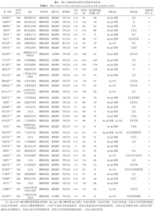 | 刘郁明等[7] | 2001 | 陕西省宝鸡市 | 横断面调查 | 随机抽样 | 学校儿童 | 3~10 | 588 | 165 | Hp-IgG检测 | ①② | 7 |