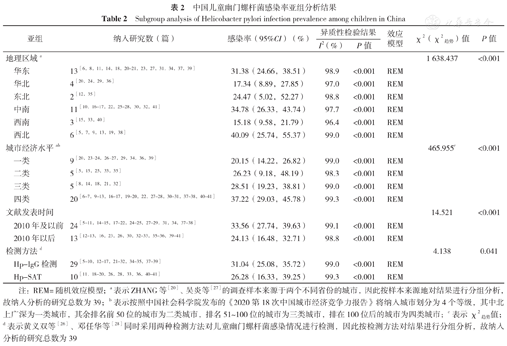 中国儿童幽门螺杆菌感染率亚组分析结果