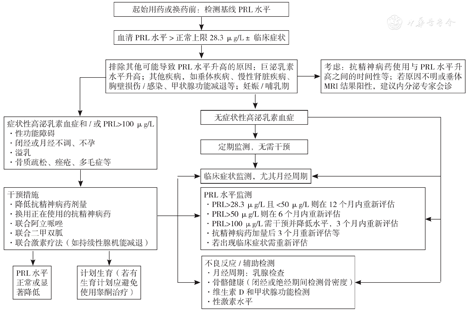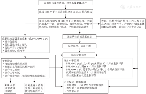 对于高泌乳素血症的治疗,研究人员提倡在抗精神病药治疗前即测量患者的泌乳素水平,以获得其基线数值,方便后续对比监测。若患者在后续治疗中,泌乳素水平高于正常上限,则需进行鉴别排查。若排除了其他可能导致泌乳素水平增高的影响因素,确定是抗精神病药所致高泌乳素血症,则根据患者当前是否有泌乳素水平增高的相关临床症状分别处理。若患者仅存在泌乳素水平增高而无相关临床症状,则暂时不需处理而需要进行密切监测;若患者存在相关临床症状,则建议参考流程建议进行处理。抗精神病药导致的高泌乳素血症男性患者处理流程建议[9]见图2。抗精神病药导致的高泌乳素血症女性患者的处理流程建议[9]见图3。