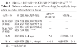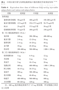 国内已上市的长效针剂不同药物分子耐受性测试见表5[72,74,75,76]。不同长效针剂与各种抗精神病口服药物的等效剂量资料见表6[42,43,44,51,73]。