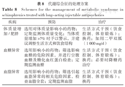 第二版中国精神分裂症防治指南提出,所有患者在用药前要评估发生代谢综合征的风险,合理选用抗精神病药物,如患者偏胖或已有代谢方面的问题,应尽量不选用对代谢影响大的药物,建议定期监测体质量、血糖和血脂,建议患者调整饮食结构及生活方式,增加锻炼,必要时换药[15]。代谢综合征的处理方案见表8。