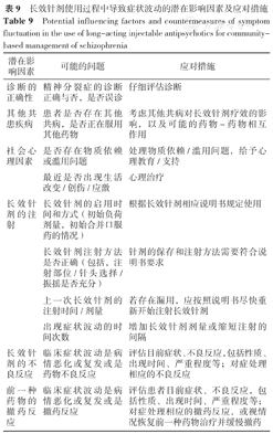 2020年中国长效针剂专家共识对原因做了以下梳理,若患者在使用长效针剂治疗过程中出现症状波动,建议应首先探寻导致患者出现症状波动的因素,并根据不同的因素做出相应处理[9],见表9。