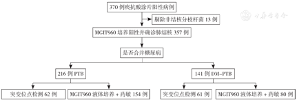 我国是结核病和糖尿病高负担国家[1],耐药结核病(drug resistant tuberculosis,DR-TB)是当前全球健康的一个严重威胁,其发病率、病死率高,治疗复杂,花费巨大[2],是人类战胜结核病的重大阻碍。临床上糖尿病合并肺结核很常见。近年来,国内外在糖尿病对肺结核耐药率、疗效差异、复发率等方面有一些临床研究,但结论并不统一[3,4]。有研究发现合并糖尿病的肺结核(DM-PTB)比单纯肺结核(PTB)有更高的异烟肼耐药率,但利福平耐药无差异[5],也有研究表明DM-PTB的耐药率与PTB无差异[6]。国外有研究发现DM-PTB患者异烟肼、利福平和吡嗪酰胺的耐药率较高,相较于PTB更有可能出现耐多药结核病[7]。通过查阅文献发现,既往研究多以回顾性研究为主,糖尿病对肺结核菌株表型耐药、基因突变影响的前瞻性对比研究尚少。为进一步探究糖尿病对肺结核耐药的影响,本研究前瞻性地对DM-PTB及PTB患者进行表型耐药、基因突变检测,旨在为后续研究提供参考。
