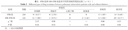 两组患者异烟肼、利福平、链霉素单耐药率以及多耐药率比较,差异均无统计学意义(P>0.05);DM-PTB组耐多药率高于PTB组,差异有统计学意义(P<0.05),见表2。