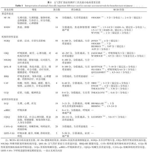 注:MCID=最小临床重要差值,SF-36=健康调查简表,HADS=医院焦虑和抑郁量表,SGRQ=圣乔治呼吸问卷,CRQ=慢性呼吸系统疾病问卷,SOLDQ=西雅图阻塞性肺疾病问卷,QOL-B=支气管扩张症生活质量问卷,BHQ=BE健康问卷,CAT=慢性阻塞性肺疾病评估测试,CCQ=慢性阻塞性肺疾病临床呼吸问卷,LCQ=莱斯特咳嗽问卷,mMRC=呼吸困难评分,CQLQ=咳嗽生活质量问卷,CASA-Q=咳嗽和咳痰评估问卷,LRTI-VAS=下呼吸道感染视觉模拟量表;—表示无相关内容