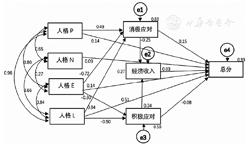 为进一步探讨人格特征、应对方式、经济收入等变量与新型毒品成瘾者心理健康状况的关系以及各自变量之间的相互关系。在查阅文献和运用经验法的同时,结合本研究相关分析结果,做出研究假设并构建初始模型,研究采用广泛最小二乘法(generalized least square,GLS)进行参数估计,将调查数据与研究假设模型进行多次拟合修正,最终确定路径分析模型。模型中内因观察变量为SCL-90总分,外因观察变量为EPQ(人格P、人格E、人格N、人格L)4个分量表的得分,中介变量为积极应对得分、消极应对得分和经济收入。路径分析结果显示,χ2=15.010,χ2/df=1.876,P=0.059,NFI=0.948,RFI=0.817,IFI=0.975,CFI=0.973,TLI=0.905,RMSEA=0.067,均表示该模型拟合较好,见图1。