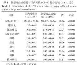 新型毒品成瘾组SCL-90总分及各维度得分均高于国内常模组(正常人SCL-90)[11],差异有统计学意义(P<0.001),见表1。