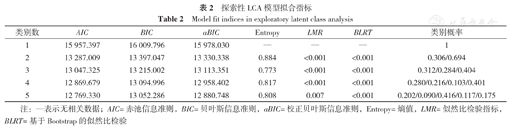 除LCA外,还有许多其他方法可对研究对象进行分组,如聚类分析、Taxometric分析法等。但是与聚类分析相比,LCA是基于模型的方法,分类的标准和结果的检验更为合理;与Taxometric分析法相比,Taxometric分析法只能将研究对象分为2个类别[14]。因此,本研究采用LCA法将研究对象进行分组。