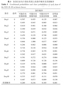 Conditional probabilities and class probabilities of each item of the CES-D-10 on latent classes
