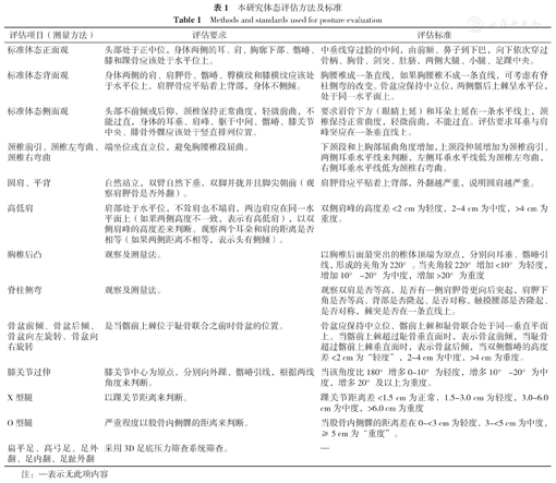 体态检查包括颈椎(是否存在颈椎前引、颈椎左弯曲、颈椎右弯曲)、肩背(是否存在圆肩、平背、高低肩)、脊柱(是否存在胸椎后凸、脊柱侧弯)、骨盆(是否存在骨盆前倾、骨盆后倾、骨盆向右旋转、骨盆向左旋转)、下肢(是否存在膝关节过伸、X型腿、O型腿)、踝足(是否存在扁平足、高弓足、足外翻、足趾外翻)检查,检查方法为3D足底筛查设备及标准化体态评估法结合。体态评估方法及标准见表1。视力检查方法为视力筛查仪和视力筛查表结合,视力筛查采用RM-9000电脑验光仪,由专业医护人员操作。