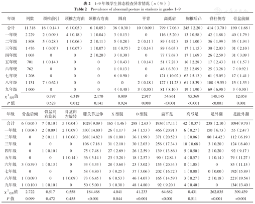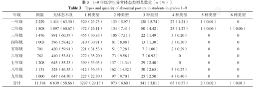 1~9年级学生异常体态类型及数量〔n(%)〕