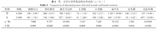 男生的胸椎后凸、脊柱侧弯、扁平足、足趾外翻检出率高于女生,膝关节过伸、X型腿、O型腿、足外翻检出率低于女生,差异有统计学意义(P<0.05),见表4。