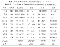 本研究11 318名学生视力异常8 486名,异常率为74.99%;其中4 725名(41.75%)学生近视,2 959名(26.14%)学生远视,802名(7.09%)学生散光。1~6年级小学生近视率为29.00%,7~9年级初中生近视率为72.21%,随着年级升高近视率升高、远视率降低(P<0.05),见表5。
