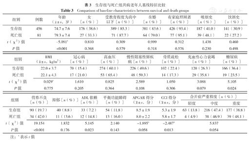 | 生存组 | 456 | 74.7±7.6 | 176(38.6) | 389(85.3) | 381(83.6) | 426(93.4) | 187(41.0) | 141(30.9) |