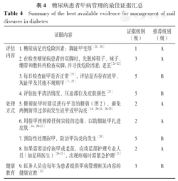 本研究检索了糖尿病患者甲病管理相关的临床决策、指南及专家共识,通过分析总结了糖尿病患者甲病管理的最佳证据,涉及评估内容、处理方式、健康教育3个方面,证据等级为A级推荐和B级推荐,可为医务人员针对糖尿病患者进行甲病的早期评估与处理提供循证证据。