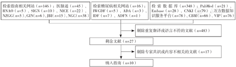 初筛检索到510篇指南或文献(指南相关网站146篇,糖尿病相关网站16篇,数据库348篇),剔除重复或非中英文文献483篇、专家共识或内容不相关的文献17篇后,最终纳入10篇指南[4,5,15,16,17,18,19,20,21,22]。指南筛选流程及结果见图1。