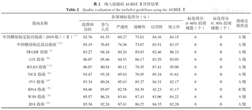 | 中国糖尿病足防治指南(2019版)(Ⅱ)[5] | 82.76 | 61.35 | 69.27 | 75.61 | 84.16 | 84.15 | 6 | 0 | A级 |