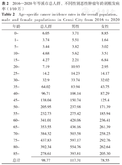 Age-specific cancer incidence rates in the overall population,male and female populations in Cenxi City from 2016 to 2020