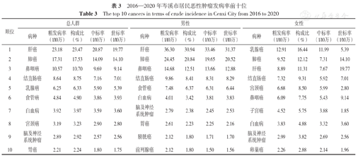 The top 10 cancers in terms of crude incidence in Cenxi City from 2016 to 2020