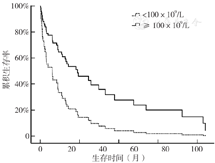 使用Kaplan-Meier法绘制生存曲线(图1),中位生存时间为10.93个月。分析全因死亡的风险因素,首先使用单因素Cox回归分析,以全因死亡结局(赋值:0=否,1=是)为因变量,以BMI(赋值:实测值)、HM类型〔赋值:白血病=(0,0)、淋巴瘤=(1,0)、骨髓瘤=(0,1)〕、化疗(赋值:0=否,1=是)、放疗(赋值:0=否,1=是)、平均动脉压(赋值:实际值/10)、心率(赋值:实测值/10)、左心室射血分数(赋值:实测值)、血红蛋白(赋值:实际值/10)、FIB(赋值:实测值)、白蛋白(赋值:实测值)、血小板计数<100×109/L(赋值:0=否,1=是)、BNP升高(赋值:0=否,1=是)为自变量,进行单因素Cox回归分析结果显示,BMI、HM类型、化疗、放疗、平均动脉压、心率、左心室射血分数、血红蛋白、FIB、白蛋白、血小板计数<100×109/L、BNP升高可能是CAD合并HM患者全因死亡的影响因素(P<0.05),见表5。采用向前步进(似然比)法进行多因素Cox回归分析,结果显示,BMI升高〔HR=0.841,95%CI(0.761,0.930),P=0.001)〕、接受化疗〔HR=0.340,95%CI(0.182,0.637),P=0.001〕、白蛋白升高〔HR=0.934,95%CI(0.889,0.982),P=0.008〕是CAD合并HM患者全因死亡的保护因素,FIB升高〔HR=1.635,95%CI(1.291,2.071),P<0.001〕、血小板计数<100×109/L〔HR=2.500,95%CI(1.336,4.678),P=0.004〕是CAD合并HM患者全因死亡的危险因素,见表6。控制其他协变量,绘制不同血小板水平的生存函数曲线,血小板计数<100×109/L的患者累积生存率低于血小板计数≥100×109/L的患者,差异有统计学意义(P<0.05),见图2。
