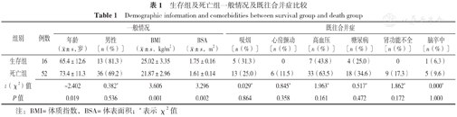 死亡组患者年龄大于生存组,BMI、BSA小于生存组,差异有统计学意义(P<0.05);两组性别及既往合并症比较,差异无统计学意义(P>0.05),见表1。