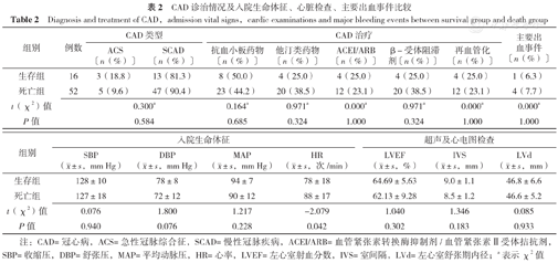死亡组患者CAD类型、CAD治疗、主要出血事件比例、超声及心电图检查、入院血压与生存组比较,差异无统计学意义(P>0.05)。死亡组患者入院时心率大于生存组,差异有统计学意义(P<0.05),见表2。