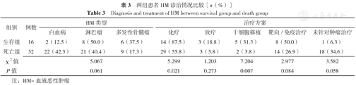 Diagnosis and treatment of HM between survival group and death group
