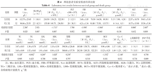 与生存组比较,死亡组患者血红蛋白、白蛋白水平更低,胱抑素C水平、BNP升高比例更高,差异有统计学意义(P<0.05);两组血小板计数、FIB、血清肌酐、尿素氮、丙氨酸氨基转移酶、白蛋白、总胆固醇、三酰甘油、低密度脂蛋白、高密度脂蛋白、尿酸、乳酸脱氢酶、同型半胱氨酸、心肌酶异常比例比较,差异无统计学意义(P>0.05),见表4。