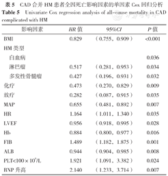 Univariate Cox regression analysis of all-cause mortality in CAD complicated with HM