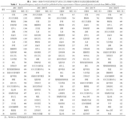 2001—2005年,研究热点主要为疾病的临床分析/临床观察、社区卫生服务、乡镇卫生院、乡村医生等;2005—2009年,慢性病的治疗、护理及新型农村合作医疗成为研究的热点问题;自2010年,关于WONCA的介绍和研究得到关注;2015年及以后,疾病的影响因素、分级诊疗、家庭医生签约服务、生存质量等成为研究的焦点问题,见表2。