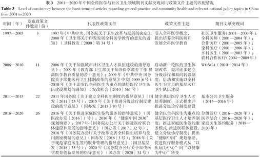 2001—2020年是我国全科医学与社区卫生的快速发展阶段。(1)1989年全科医学概念被引入我国内地,1997年《中共中央、国务院关于卫生改革与发展的决定》做出"加快发展全科医学,培养全科医生"的决策,全面推动了全科医学发展。各地政府相继推出相关地方政策,政策发展的主题主要为:引入全科医学概念,提出培养全科医师和发展全科医学教育。(2)随着2009年新一轮医药卫生体制改革的启动,我国政府提出逐步建立分级诊疗和双向转诊制度,启动和实施以全科医生为重点的基层医疗卫生队伍建设。该阶段期刊文献的突现词为WONCA(2010—2014年),未见"全科医师培养""全科医学教育""分级诊疗"等相关关键词。(3)2011年《国务院关于建立全科医生制度的指导意见》(国发〔2011〕23号)的发布是全科医学发展的"里程碑",文件提出逐步建立统一规范的全科医生制度、培养合格全科医生、改革全科医生执业方式、建立健全激励机制等内容。2015年《国务院办公厅关于推进分级诊疗制度建设的指导意见》(国办发〔2015〕70号)正式提出建立分级诊疗制度。该阶段期刊文献的突现词为基本公共卫生服务(2013—2016年)。(4)2016—2020年是4个时间段中发布全科医学与医药卫生体制改革相关政策文件数量最多的阶段。2016年《关于推进家庭医生签约服务的指导意见》(国医改办发〔2016〕1号)提出,通过建立家庭医生签约服务制度,借助家庭医生的综合服务,能够帮助缺乏专业知识的患者提升合理选择医疗机构就医的行为能力,使其获得长期、协同的健康照顾,促进分级诊疗实践的开展。同年,《"健康中国2030"规划纲要》发布,提倡促进医疗服务模式从"以疾病为中心"向"以健康为中心"转变。在该阶段期刊文献的突现词为分级诊疗(2016—2020年)、医养结合(2016—2020年)、家庭医生签约服务(2018—2020年)。期刊文献突现词与政策文件主题的匹配情况见表3。