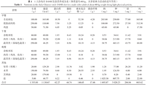 1人份每日DASH饮食营养成分表(体质量约60 kg、从事轻体力活动的老年男性)