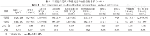 干预后,受试对象总胆固醇、低密度脂蛋白胆固醇、收缩压、舒张压、餐后2 h血糖水平较干预前下降,差异有统计学意义(P<0.05);BMI、腰臀比、三酰甘油、高密度脂蛋白胆固醇、空腹血糖水平与干预前相比,差异无统计学意义(P>0.05),见表5。