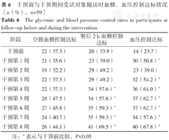 受试人群干预前空腹血糖、餐后2 h血糖、血压控制率分别为37.3%、33.9%、23.73%。从干预第4周开始,受试人群随访时餐后2 h血糖控制率高于干预前水平,差异有统计学意义(P<0.05),干预结束时达69.5%;干预期间受试人群随访时空腹血糖控制率与干预前相比,差异无统计学意义(P>0.05),干预结束时为44.1%;除干预第2周外,干预期间受试人群随访时血压控制率均高于干预前水平,差异有统计学意义(P<0.05),干预结束时达到67.8%,见表6。