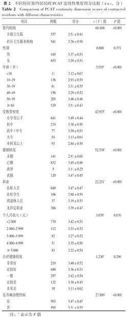 不同签约机构、年龄、受教育程度、婚姻状况、职业及是否确诊慢性病签约居民的PCAT连续性维度得分比较,差异有统计学意义(P<0.05),见表2。
