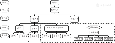 成为楚氏伤科传承弟子须满足以下条件:(1)拥有中医背景;(2)经过3年的规范化培训,能够掌握所有伤科基础理论;(3)至少经过1年的跟学。经考核合格,传承弟子方能拥有独立出诊的资格。本中心经过全方位的考察,最终选择了3名拥有中医背景的医生作为传承弟子(图2),要求其跟从当前在外滩街道社区卫生服务中心提供楚氏伤科特色服务的楚氏伤科非遗传承人(传承人4)学习[13]。学习期满后,3人已具备可以独立开设楚氏伤科弟子门诊的能力。目前楚氏伤科已经传承至第五代;与之前只有两名能够提供楚氏伤科服务的医生不同,现今楚氏伤科已拥有多名优秀的传承弟子及能发挥协助作用的临床团队,这不仅提升了楚氏伤科的服务效率,还有助于提高楚氏伤科的服务质量。