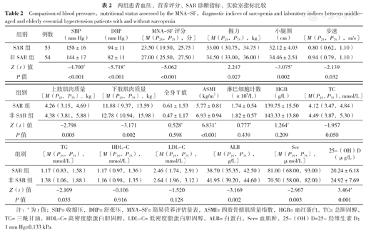 Comparison of blood pressure,nutritional status assessed by the MNA-SF,diagnostic indices of sarcopenia and laboratory indices between middle-aged and elderly essential hypertension patients with and without sarcopenia