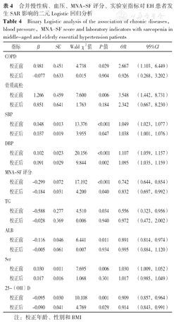 Binary Logistic analysis of the association of chronic diseases,blood pressure,MNA-SF score and laboratory indicators with sarcopenia in middle-aged and elderly essential hypertension patients