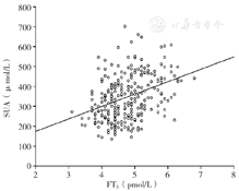 Pearson相关分析结果显示,EH患者参考范围内FT3水平与SUA水平呈正相关(r=0.327,P<0.001),见图1。